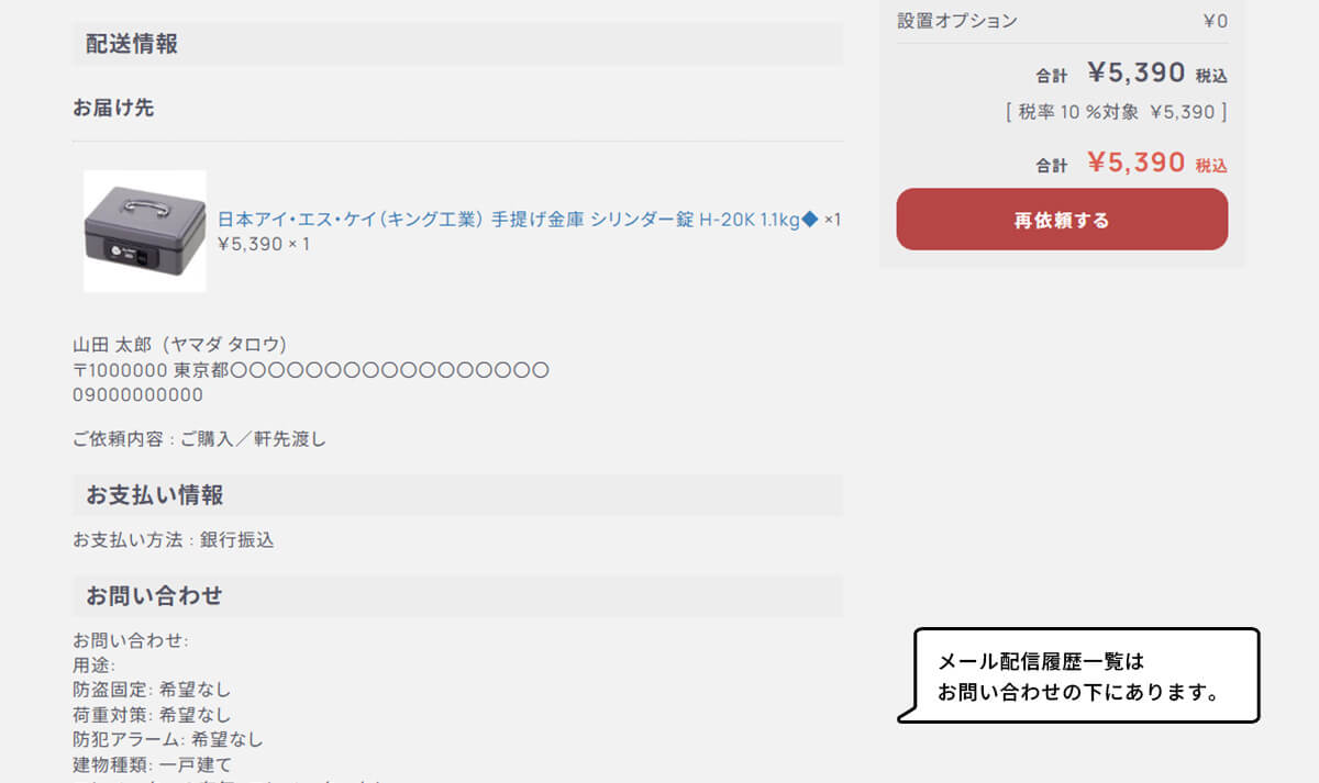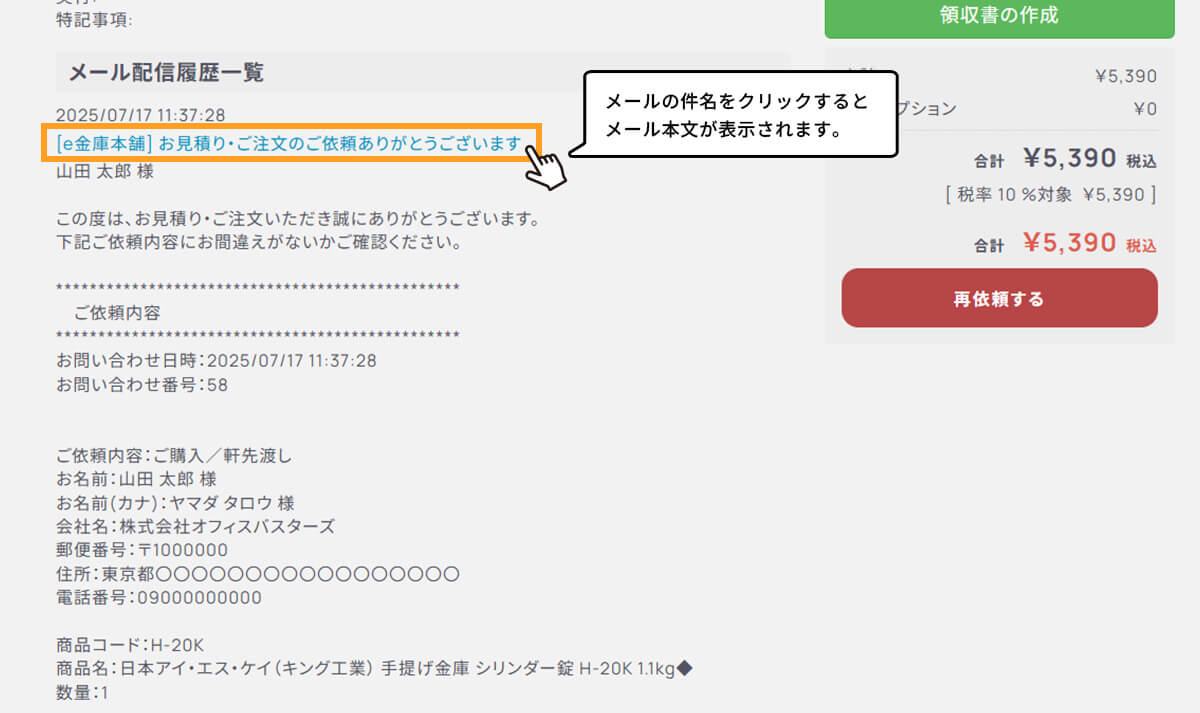 注文履歴最下部の「メール配信履歴一覧」にあるメールの件名をクリックすると、e金庫本舗から配信した注文確認メールの内容を見る事ができます。
